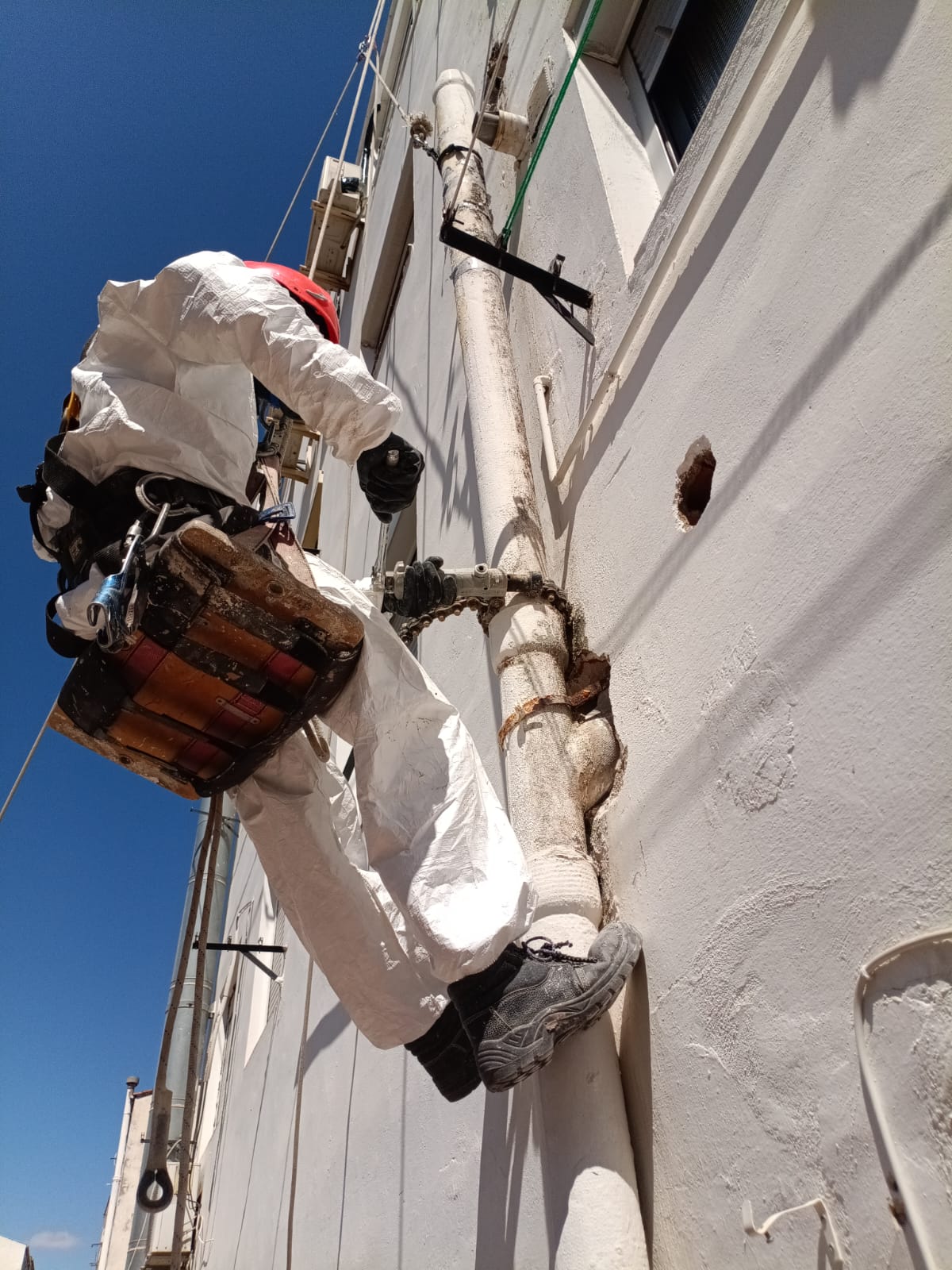 Uno de los trabajos más habituales es la retirada de bajantes de fibrocemento en patios interiores, donde el acceso es complejo y el riesgo aumenta por: